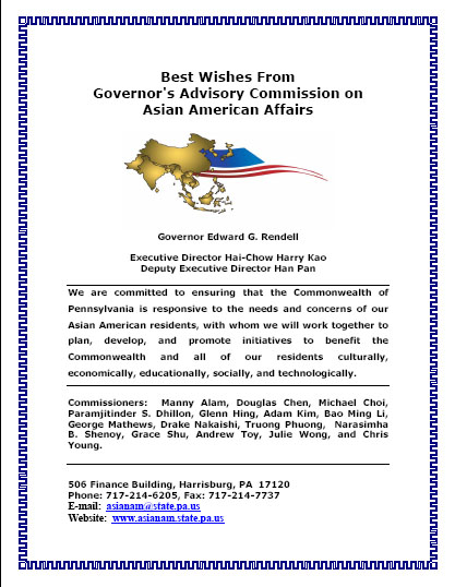 The greeting and best wishes from Pennsylvania Governor Rendell for the Flora Wu Music school's contribution to the aisan culture exchange on Asian American Affairs |