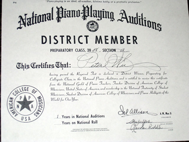 ACM Piano Audition Certificate